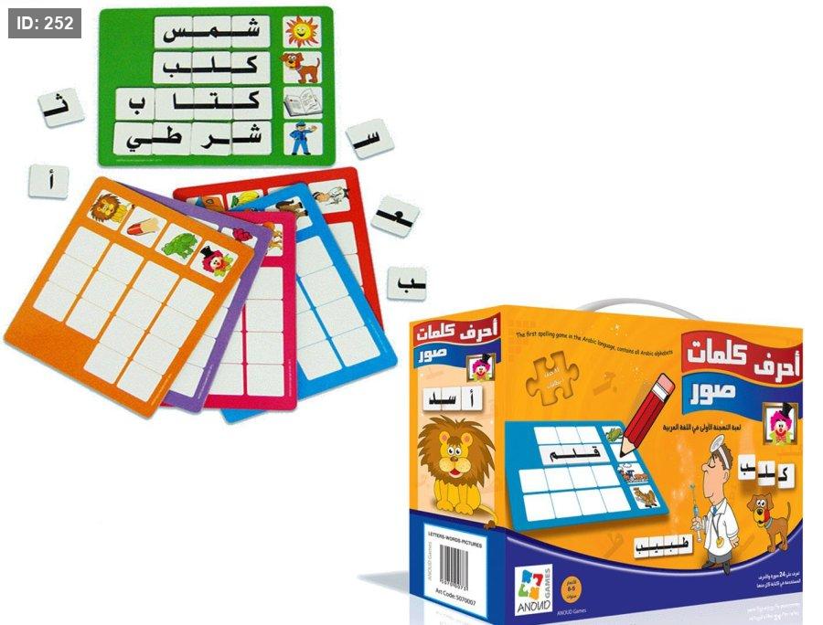 الوصف: لعبة ألغاز كلمات 1 متقاطعة يقوم فيها الأطفال بتكوين كلمات باستخدام عناوين تحتوي على حروف عربية بأشكال مختلفة (بداية الكلمة ووسطها ونهايتها). تعمل اللعبة على إثراء مهارات المفردات والإملاء في مراحل التعلم المبكرة. يأتي اللغز مع 84 حرف, و 6 بطاقات كبيرة (تتضمن 24 صورة) لبناء الكلمات ، ودفتر لتسجيل درجات اللاعب. تم تصميم اللغز للأطفال الذين تتراوح أعمارهم بين 4-7 سنوات ولمتعلمي اللغة العربية الذين هم في مرحلة تعلم الحروف والكلمات والهجاء والنطق.